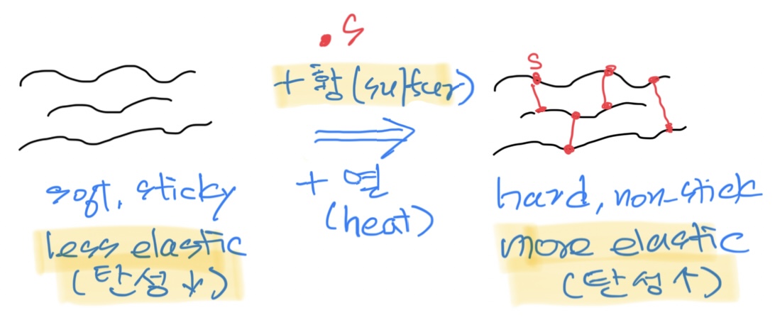 굿이어가 개발한 공정은 로마 불의신 Vulcan에서 따온 가황(vulcanization) 공정이라 불러. 자연고무는 늘어난(stretch) 뒤 제자리로 돌아오면서 분자들이 어긋나 탄성(elasticity)을 잃어 버리는데, 가황공정을 통해 혼합된 황(sulfur)이 이중황(disulfur, -S-S-) 결합을 만들어 잡아주면서 탄성을 계속 유지하게 되었어. 혼합된 황(sulfur)의 농도에 따라 고무의 경도도 조절 할 수 있어.
