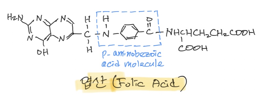 그런데, 엽산 화합물 구조의 중간에 위치한 분자(p-aminobenzoic)의 크기와 구조가 설파닐아미드 분자와 거의 유사해, 세균의 엽산을 만드는 어수룩한 엽산 합성 효소(enzyme)가 p-aminobenzoic와 설파닐아미드 분자를 구별하지 못하고 쓰면서 불량 엽산이 만들어져 (일종의 작동하지 않는 불량품을 만들어) DNA 복제와 세포 분열이 중단되어 증식이 억제되는 거지. 외부에서 섭취하는 인간에게는 전혀 무해 🙂.