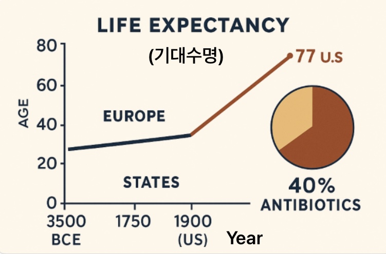 유럽의 기대 수명은 BC 3500~ AD 1750년까지 거의 변화 없이 30~40세 였고, 미국의 경우도 1900년대 초반 47세 였는데 2000년대로 넘어오며 77세로 획기적으로 늘어났어. 여러 이유 중 약 40%는 항생제 사용으로 인해 감염병 사망률 감소의 영향이라고 알려져 있어. 특히 예방주사로 인한 아동 사망률 감소.