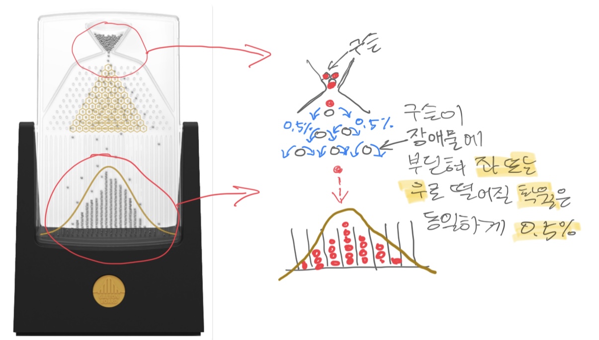어려서 비슷한 구슬 장난감을 본 기억이 있는데, ‘갈튼보드(Galton Board)’라고 불리는 구슬 장치가 있어. 이항분포하는 사건이 충분한 표본만 있다면 정규분포에 가까워진다는 ‘중심극한정리(CLT)’ 이론을 시각적으로 잘 보여줘.