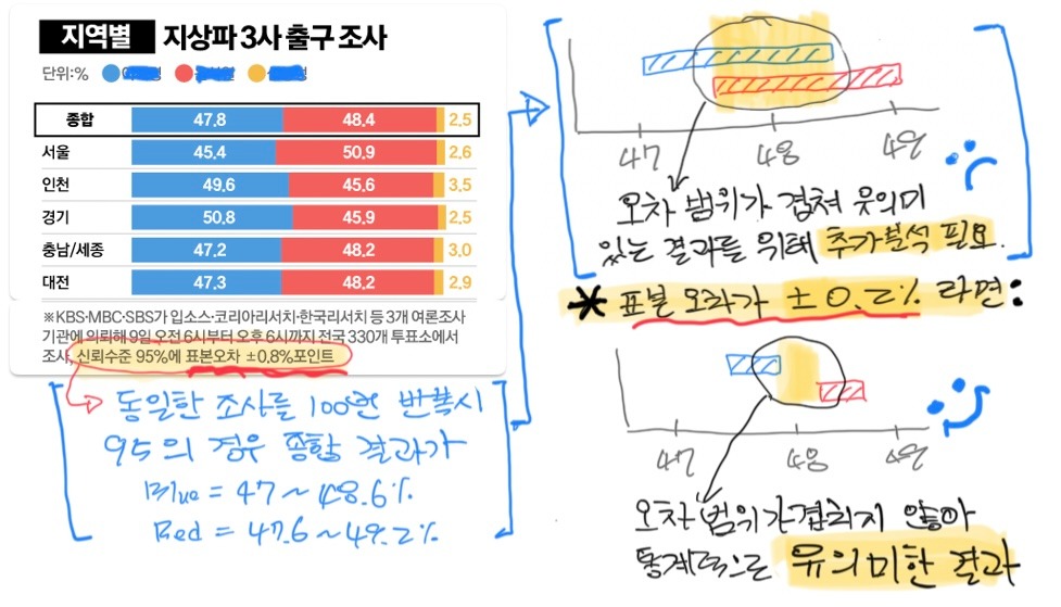아래 지상파 출구조사에서 보일듯 말듯 작은 글씨로 “신뢰수준 95%에 표본오차 +-0.8포인트’란 말은 (우측 위 Bar 차트와 같이) 푸른당과 빨간당 지지율의 신뢰구간이 서로 겹치는 구간이 너무 커서 빨간당이 우위에 있기는 하지만, 혹시 빨간당이 지더라도 조사기관의 잘못은 아니라는 말이야.