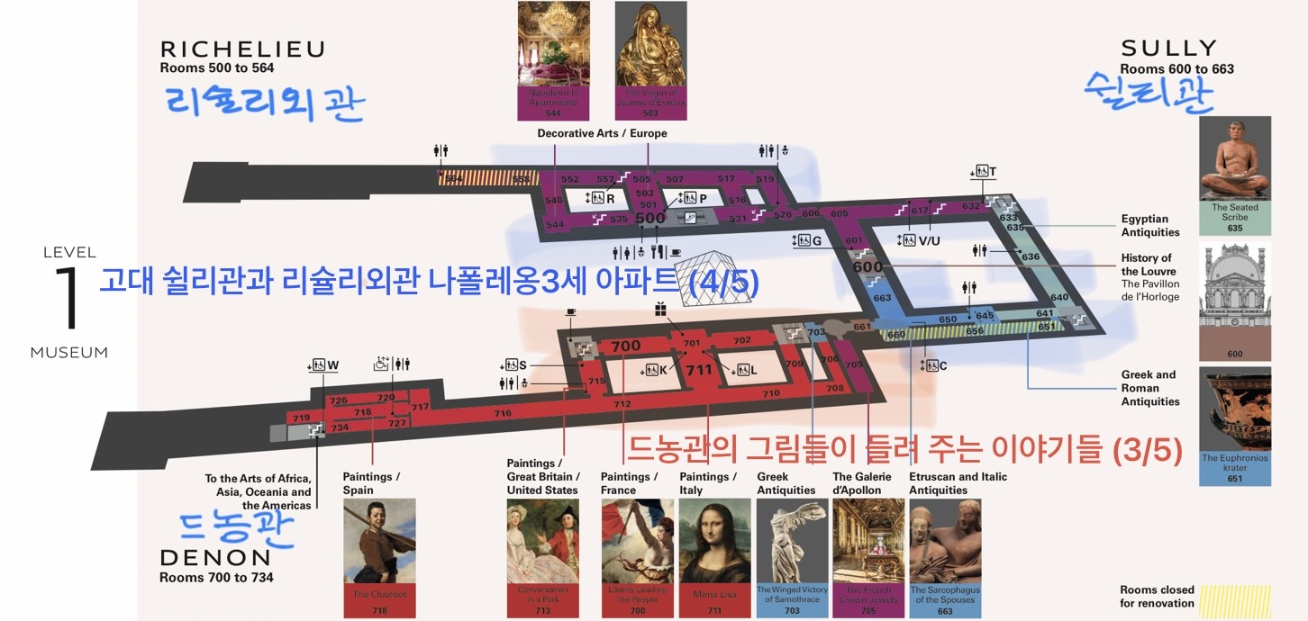 뮤지엄을 경험하는 방법이 사람마다 다르고 박물관 특징에 따라 다르겠지만, 루브르는 일단 전시 작품의 수와 박물관의 크기를 고려해 미리 방문 계획이 필요하다.