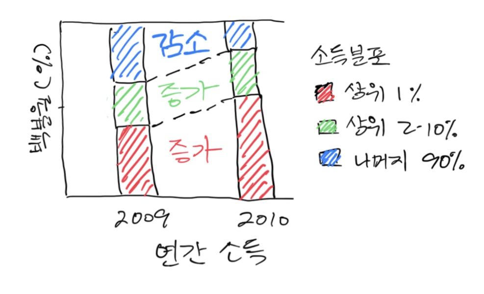 하지만, 좀더 신중한 결론을 위해 정부 발표 세부 통계를 살펴 보면, 상위 1%을 제외한 상위 10%(즉, 2~10%)의 소득 증가율은 17%로, 이 수치만 단순히 더하면 110%가 되네 (상위 1%의 93%와 상위 9%의 17%를 합쳐).