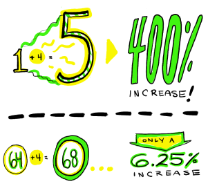 짜장면 가격을 올릴 때 “10,000원에서 2,000원 올려 12,000원 입니다” 하는 것 보다는 “20% 올렸습니다” 하는게 충격이 덜한 건, 20%가 얼마나 되나 계산하는 동안에 카드 계산은 벌써 끝나 있기 마련이다.