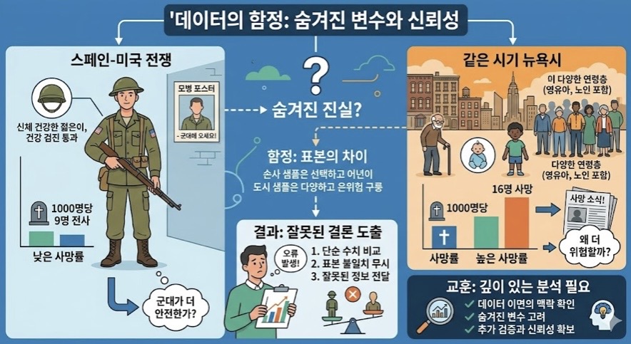 하지만 이 비교에서 숨기고 있는 것은, 전쟁에서 사망한 표본은 신체 건강한 젊은이들이고, 뉴욕시 사망자 표본에는 사망률이 높은 영유아와 노인이 포함되어 있다.