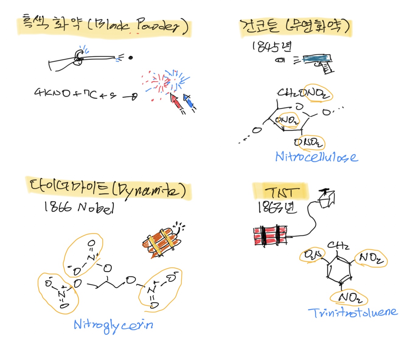 건코튼(Guncotton): 1845년, 스위스 화학자 쇤바인(Schoenbein)이 발견했어. 지금과 같은 실험실이 따로 없었으니 부엌에서 질산과 황산의 혼합물을 실험 했는데, 이때 흘린 산혼합물을 대충 닦은 면으로 만든 앞치마를 말리려고 스토브 위에 놓은 게 폭발해 건코튼을 우연하게 발견했어. 혼합산(HNO₃ : H₂SO₄)에 면솜을 담갔다 세척 및 중화하는 비교적 단순한 과정으로 면솜을 이루는 수산기(OH)를 질산기로(NO2)로 치환해, 폭발성이 강한 건코튼(니트로셀룰로오스)을 만들 수 있어. 과학의 역사를 쓴 책을 보면 우연한 발견이라는 뜻의 ‘Serendipity’ 라는 단어를 많이 보게 돼. 하지만 모든 우연한 과학적 발견의 뒤에 늘 엄청난 노력과 천재성이 있듯이, 그 우연한 발견을 하기 전에 쇤바인이 했을 수없이 많은 실험과 폭발이 발생했을 때 역추론을 통해 폭발물 성분과 조건을 찾아낸 과정을 단순히 우연이라고 말할 순 없어. 이 발견만으론 건코튼을 상품으로 만들 수 없어 정작 쇤바인은 큰돈을 벌지는 못했지만, 이후 더 안전하게 만들고 건코튼이 발생하는 충격파(shock wave)의 강도나 속도가 총을 비롯한 무기에 사용하기 적당하게 조정하는 개발을 통해 현재 대부분의 총기용 화약은 건코튼을 원료로 한 무연화약이야.